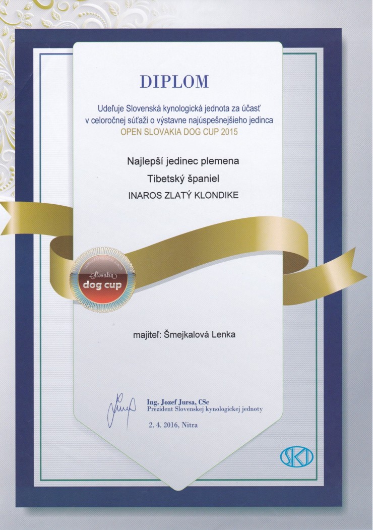 TOP Tibeťák 2015 - 1. místo, psi TOP Tibeťák 2015 - absolutní vítěz Diplom SKJ (nej tibeťák 2015) Světová výstava psů Brno 2021 - |